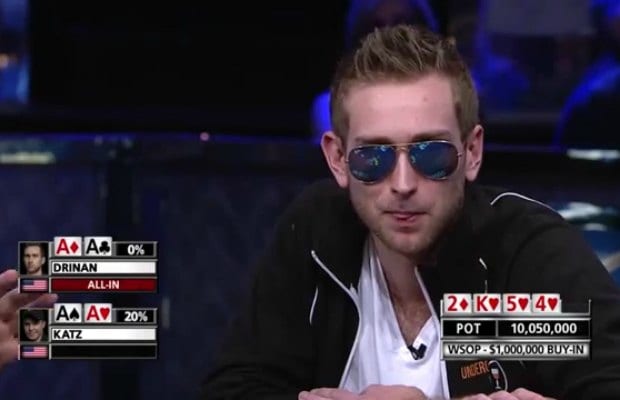 What unfolded for Drinan is downright gut-wrenching. Connor was facing Cary Katz in a one-on-one game when each player was dealt pocket aces, the best possible starting hand in Texas Hold’Em. Naturally, both of the plays thought they had the game on lock. After some pre-flop raises and taunts from Katz, they both went all-in. Only Drinan was at risk for elimination, but was holding an “Ace of Diamonds” and an “Ace of Clubs.” Pretty much unbeatable right?