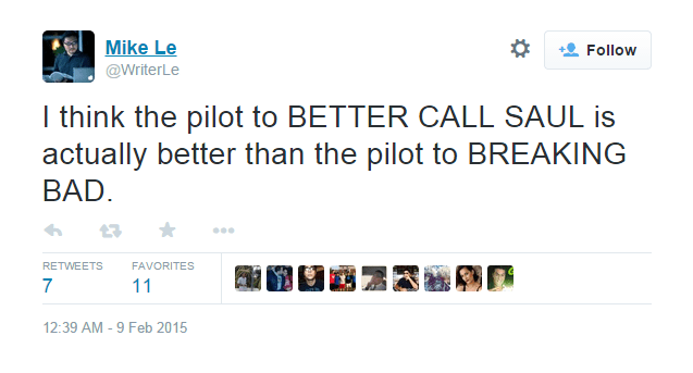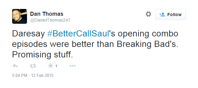 The show’s first episodes aired Sunday with the second following immediately on Monday to a generally favorable reception receiving a 78 on Metascore based on 43 critics but… Could Better Call Saul be better than Breaking Bad? Fans online seem to think so.twitter fan